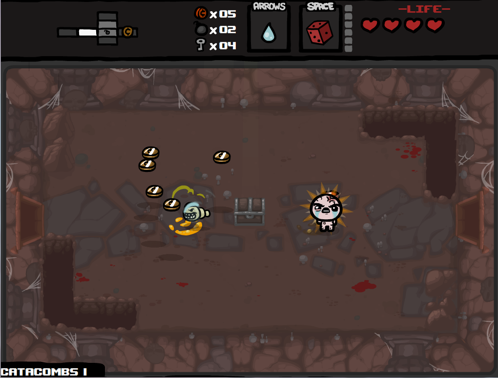 Le sous-sol à parcourir est un labyrinthe composé de pièces rectangulaires connectées par des portes. Ce système ressemble énormément à celui du premier Zelda sur la Nintendo, dont la source n'est pas cachée. Chaque pièce peut posséder des monstres qu'il vous faudra tuer afin d'ouvrir les portes. Mais Isaac n'est qu'un petit garçon et les seules armes qu'il possède sont... ses larmes ! Mais ne vous inquiétez pas, de nombreux objets vous aideront : vos larmes pourront voir leur puissance ou leurs caractéristiques augmenter, vous pouvez posséder des bombes qui font de gros dégâts en plus de briser les rochers gênants.