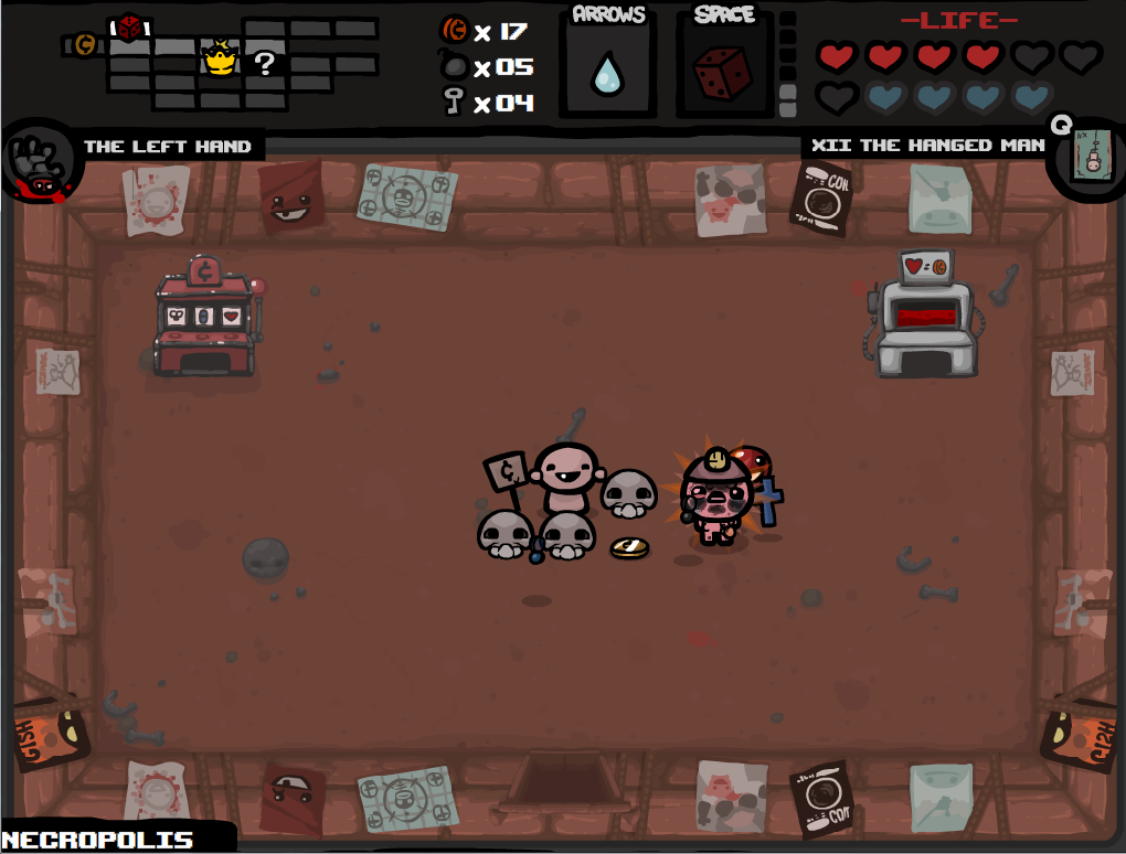 D'autres armes sont un peu plus farfelues, comme un rayon laser ou des yeux d'araignée vous faisant tirer beaucoup plus de larmes à la fois. Le côté amusant mais en même temps un peu sinistre de la chose est que Isaac change à chaque objet récupéré. Isaac pourra avoir la moitié du visage brûlé par un flacon d'acide, qui lui fera tirer des larmes plus puissantes de ce côté. D'autres objets sont un peu plus absurdes, comme un cintre qu'il aura dans le crâne et qui lui fera tirer ses larmes plus loin. Au total, ce sont plus d'une centaine d'objets qui sont disponibles si vous possédez le jeu et son extension. Le gameplay est donc très riche !