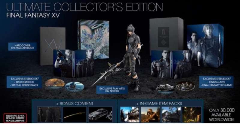 Au niveau de l'aspect collection, nous auront droit, outre le jeu de base à 60 euros, à une "Deluxe Edition" à 89,99 euros qui possèdera notamment un Steelbook décoré par le Maître Yoshitaka Amano lui-même, et à une "Ultimate Edition" à 269,99 euros, avec une figurine de Noctis haute de près de 40 cm, et d'autres bonus.