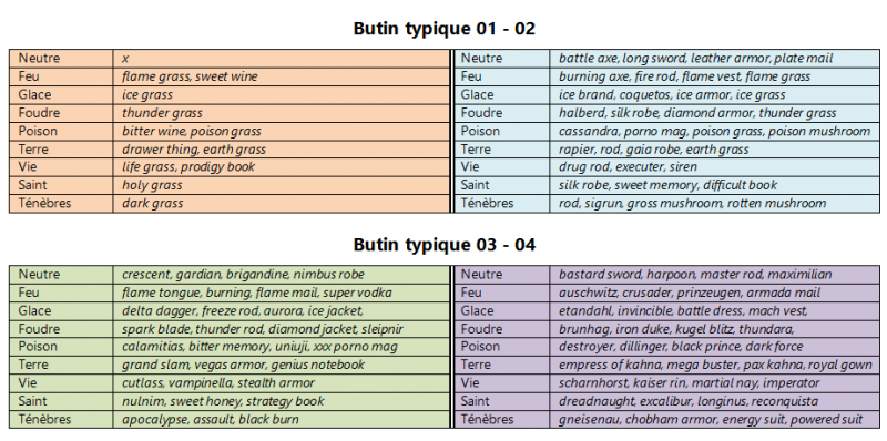 Je suis rendue à 71 ennemis sur 136 d'analysés et j'ai pu identifier 4 butins typiques. Je confirme que les éléments suivants ont une influence sur le butin obtenu : neutre, feu, glace, foudre, poison, terre, vie, saint et ténèbres. À noter que les dommages de type VIE ne fonctionnent que sur les ennemis morts-vivants, et les techniques du genre "drug-hit" ne comptent pas (elles sont de type neutre). Truc intéressant par contre : les objets curatifs peuvent être utilisés sur ces ennemis, alors c'est possible de "tricher" si on n'a pas de prêtre dans l'équipe.
