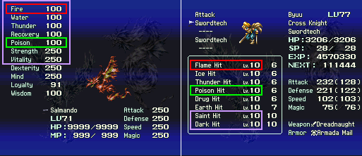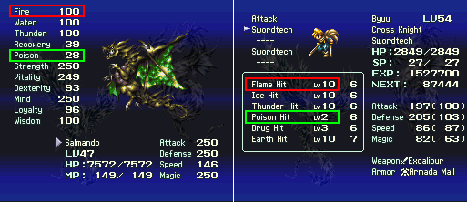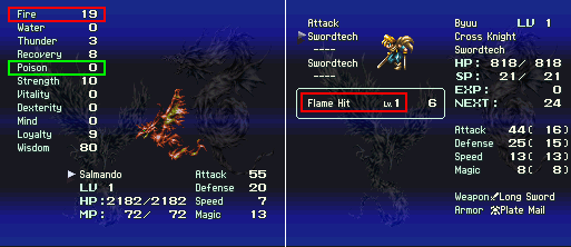 L'image ci-dessus montre bien la dépendance des techniques au dragon. Byuu n'a accès qu'à la technique Flame Hit (attribut FEU), parce que le dragon de l'équipe a 19 à la statistique FEU (niv = 1/10 de la statistique dont le maximum est 100). Byuu ne peut pas encore avoir accès à une technique d'attribut POISON, parce que le dragon n'a pas encore de points à la statistique POISON.
