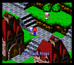 - Dès que vous parlerez au champignon qui vous demande d'actionner l'interrupteur pour faire descendre l'escalier de sa maison, prenez les 3 coffres (2 visibles et celui sur le lit) Puis sortez sans actionner l'interrupteur. Allez maintenant à la Forêt, puis au labyrinthe, allez à : « gauche, gauche, tout droit, droite » (de Mario) et prenez les coffres. Battez ensuite Bowyer et revenez au village et actionnez l'interrupteur. Lorsqu'il vous demandera où sont passés ses coffres, dites-lui la vérité et il vous donnera une Pièce Frog pour votre honnêteté. [+]