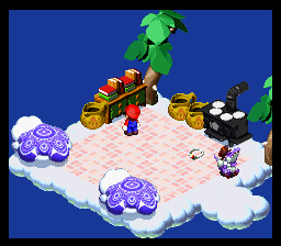 Après avoir battu Punchinello, allez à la boutique, si vous regardez bien il y a un champignon derrière le comptoir; parlez-lui et à différentes moments du jeu il vous donnera des items :
