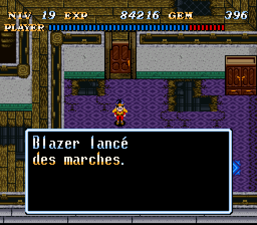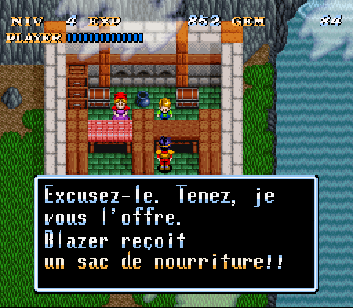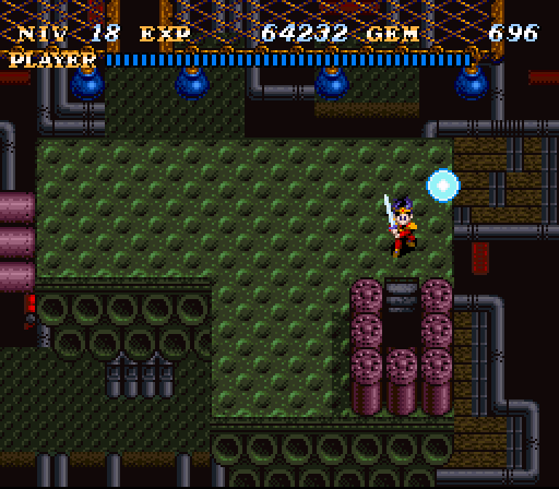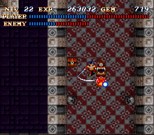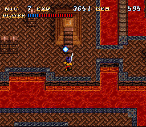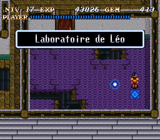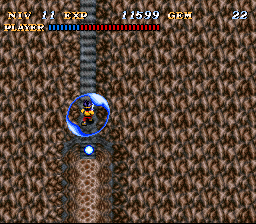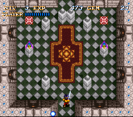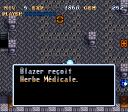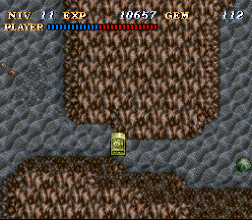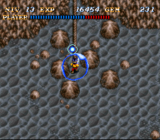 Avancez toujours vers le haut jusqu'à arriver dans une salle où vous pourrez trouver une Herbe Médicinale. [+] Dirigez-vous alors vers la droite pour passer dans la prochaine salle, en ignorant les monstres métalliques, invincibles pour le moment. Dans celle-ci, vous trouverez ces mêmes monstres. Contentez-vous de continuez votre chemin vers le nord. Vous y trouverez un téléporteur vers la salle du Maître. [+] Profitez-en pour sauvegarder et récupérer vos points de vie. Si vous n'avez plus d'Herbe Médicinale dans votre inventaire, vous pouvez aller voir la fille du marchand qui vous en donnera gratuitement. De retour dans le donjon, dirigez-vous vers la porte du haut, que vous pourrez ouvrir à l'aide d'un interrupteur. [+] Vous y trouverez le premier Boss : Solid Arm. Une fois vaincu, vous libérerez le Chef du Village. [+] Retournez alors au village à l'aide du téléporteur.