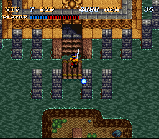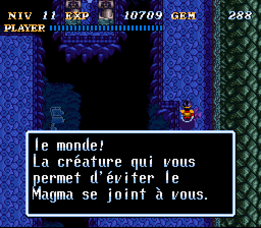 Si vous souhaitez sauvegarder ou récupérer vos points de vie, vous trouverez un bloc de téléportation vers la salle du Maître à droite, un peu plus bas. [+] Profitez-en pour aller vers un tour au Bois Vert pour aller échanger les Graines Délices contre l'Épée Psycho auprès de l'écureuil affamé [+], puis rendre visite à l'une des taupes que vous avez libérée, celle dont le trou est juste en face du crocodile. Cette taupe est en fait l'Âme de Lumière [+]. Revenez ensuite au Marais pour continuez votre chemin vers le Temple du Feu. [+]