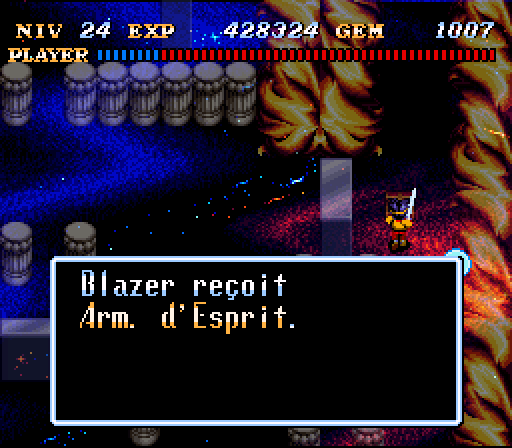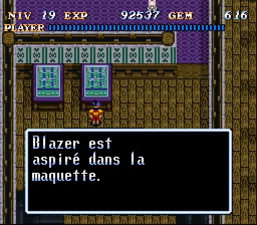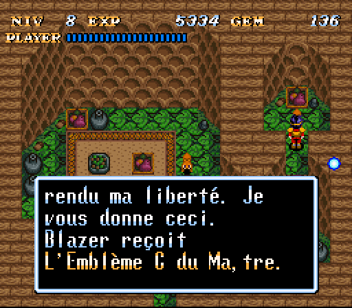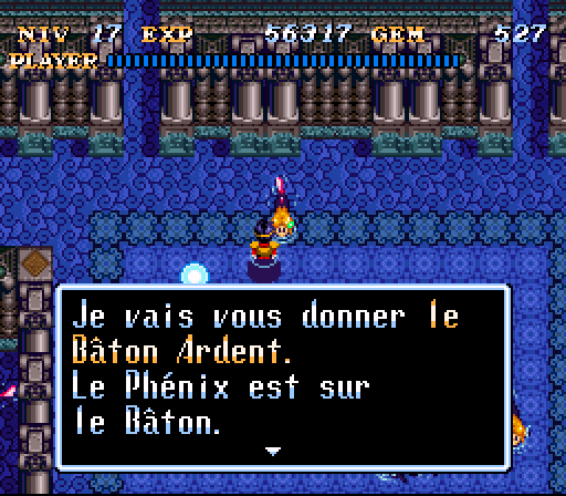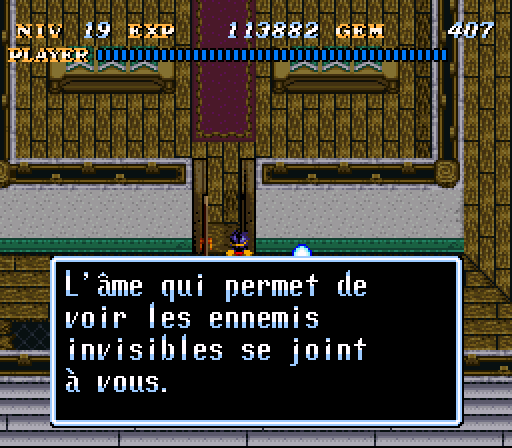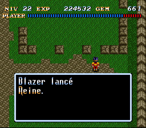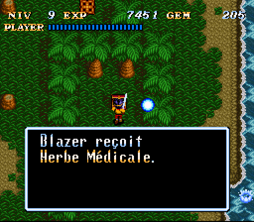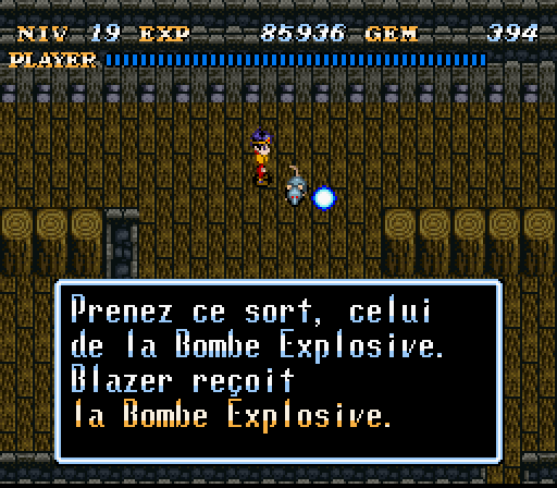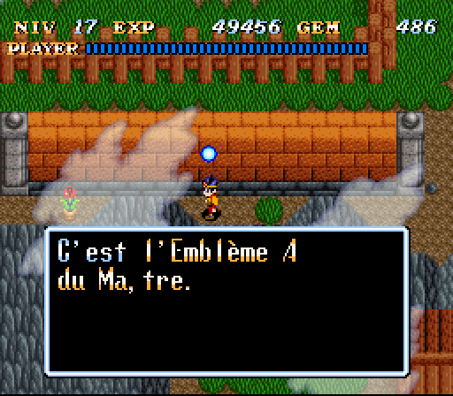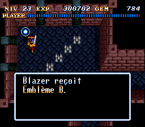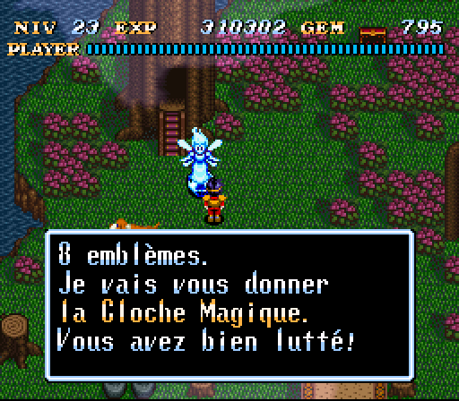 Il est temps pour vous de faire bon usage de votre Épée d'Esprit. Regagnez le Temple de la Lumière et tuez les esprits s'y trouvant. Vous pourrez libérer un oiseau, et obtenir la magie Pilier de Feu. [+] Retournez à présent dans la Forêt du Bois Vert, et parlez à l'oiseau que vous avez libéré. Attention, vous devrez l'approcher par derrière, sinon il s'envolera. Il vous fera don du Miroir Ardent. [+] Allez ensuite parler à la fée du joyau à l'ouest. Si vous avez bien suivi cette solution, vous devriez être en possession des huit emblèmes du Maître. Elle vous donnera donc la Cloche Magique. [+] Cet objet vous permettra d'utiliser vos magies à volonté, sans avoir besoin de Gems.