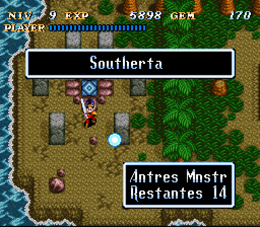 Dès que vous arriverez dans le Sanctuaire de la Mer, dirigez-vous vers le haut et parlez à la statue de sirène, qui vous demandera d'aller sur l'île Southerta. Retournez dans la salle du Maître et téléportez-vous sur l'île à l'aide du bloc de gauche. [+] Dirigez-vous vers le haut, puis vers la droite pour atteindre un monstre en forme de roche à côté d'une roche. [+] En le battant, vous ferez apparaître des gorilles. Après les avoir fait mordre la poussière, poursuivez vers la droite. Vous trouverez un coffre au trésor contenant une Herbe Médicinale. [+] Continuez vers le nord pour combattre des palmiers. Appuyez ensuite sur l'interrupteur, ce qui fera disparaître tous les arbres du coin. [+] Tuez tous les monstres qui restent, puis retournez au Sanctuaire.