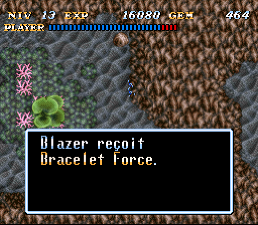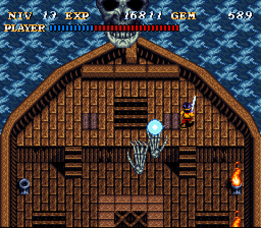 Dirigez-vous vers le nouveau passage, allez vers la droite, et prenez dans un coffre le Bracelet de Force. [+] Puis allez vers la gauche complètement pour trouver le passage que vous avez libéré lorsque vous étiez dans le rêve du dauphin. Vous y trouverez une grotte dans laquelle se trouve, dans l'un des quatre coffres, l'Emblème D du Maître. [+] Poursuivez alors votre chemin vers le nord pour trouver un bloc de téléportation vous amenant à la salle du Maître si vous désirez sauvegarder ou récupérer des points de vie. Montez alors la corde. [+] Vous vous retrouverez dans le Vaisseau Fantôme. Allez tout au nord où vous trouverez le boss de ce monde : Crâne Fantôme.