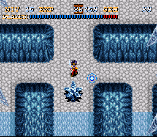 Pour atteindre la plate-forme de l'autre côté, vous devrez marcher sur le cours d'eau glacé dont l'accès est au nord. Glissez jusqu'à atteindre celle-ci. [+] Battez les monstres pour libérer un petit garçon [+] et faire apparaître une fée du joyau. Parlez-lui pour revenir à la caverne du début, et allez parlez au garçon, il vous offrira une paire de Chaussures de Champignons. [+] Retournez à l'endroit où vous étiez un peu plus tôt, équipez les chaussures et descendez sur la glace pour aller appuyer sur l'interrupteur au beau milieu de la glace. Puis allez prendre l'escalier sur la plate-forme un peu plus bas. [+]