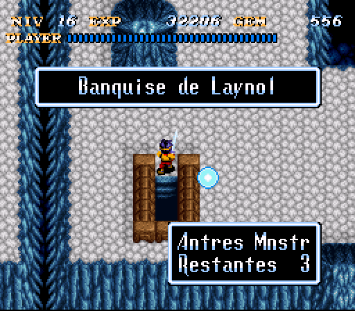Vous voici sur la Colline Glacée. Ici, rien de compliqué : descendez continuellement. Mais avant, commencez par tuez les monstres à droite complètement, mais n'oubliez pas les monstres verts en haut complèment à droite. Descendez, battez les mages afin d'ouvrir le passage. Vous ferez alors face à un énorme glaçon. [+] Si vous le frappez, il vous explosera à la figure. Descendez le passage à droite complètement, en faisant attention au glaçon sur la glace. Battez les monstres, puis descendez le passage adjacent. Continuez vers le sud jusqu'à ce que vous arriviez à la Banquise de Laynol. [+]
