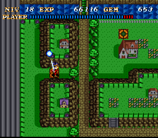 Dirigez-vous ensuite vers le nord pour faire apparaitre un autre escalier. [+] Montez-le, tuez les monstres sur votre chemin et allez vers la droite pour aller sur un tapis roulant. [+] Descendez, tuez les monstres et vous trouverez la Baguette du Rêve dans un coffre. [+] Remontez l'escalier et continuez votre chemin. Vous arriverez dans un endroit rempli de plantes. [+] Une fois vaincues, vous pourrez faire apparaître du lierre dans le village, ce qui vous permettra d'obtenir par la suite une armure. Descendez l'escalier plus bas [+] et tuez les monstres pour faire apparaître un moulin. [+] Vous pourrez constater que vous ne pouvez pas encore utiliser l'ascenseur sur votre droite. Retournez au village, entrez dans le moulin et tournez la roue. [+] Descendez au sud du village, passez par le lierre que vous avez créé, et entrez dans la grotte pour y trouver l'Armure de Fer. [+]