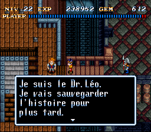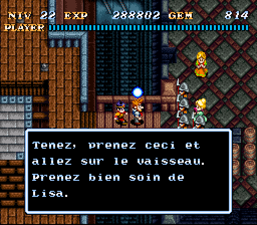Vous êtes arrivé au Couloir vers le Quai. [+] Dirigez-vous vers la gauche et vous trouverez un bloc du Maître, pensez donc à y faire une sauvegarde. [+] Vous pourrez alors avoir accès, sur la gauche, au Quai du Vaisseau Aérien. Vous y trouverez Léo et deux soldats. Lorsque vous lui parlerez, la Reine et ses hommes viendront vous attaquer, puis menaceront de tuer Lisa,