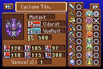 Important : pour qu'un cyclope apparaisse, il faudra vaincre un certain nombre de monstres dans l'écran où il se trouve, le bon jour et la bonne heure.