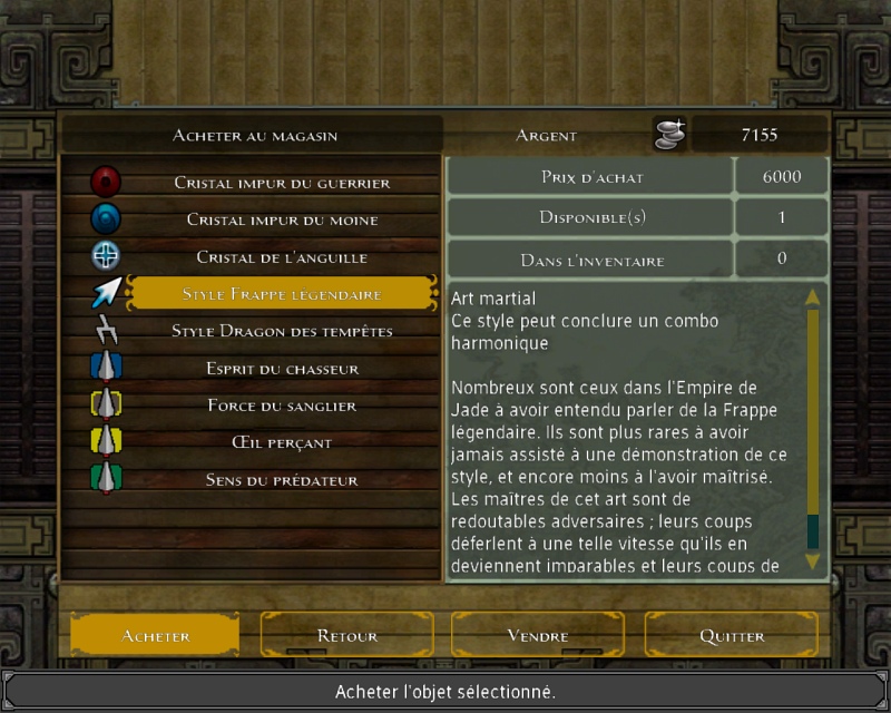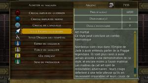On commence par la création d'une nouvelle partie. Premier défaut : seulement 6 personnages (7 avec l'édition limitée). On ne peut même pas changer leur coupe de cheveux ! Trois types possibles de personnages : Rapide, Magicien, et Fort : c'est trop peu ! Mais passons. L'interface montre trois barres d’énergie différentes : la Vie, le Chi (pour les sorts magiques) et la Concentration (les armes magiques). Le jeu commence après la création du personnage.